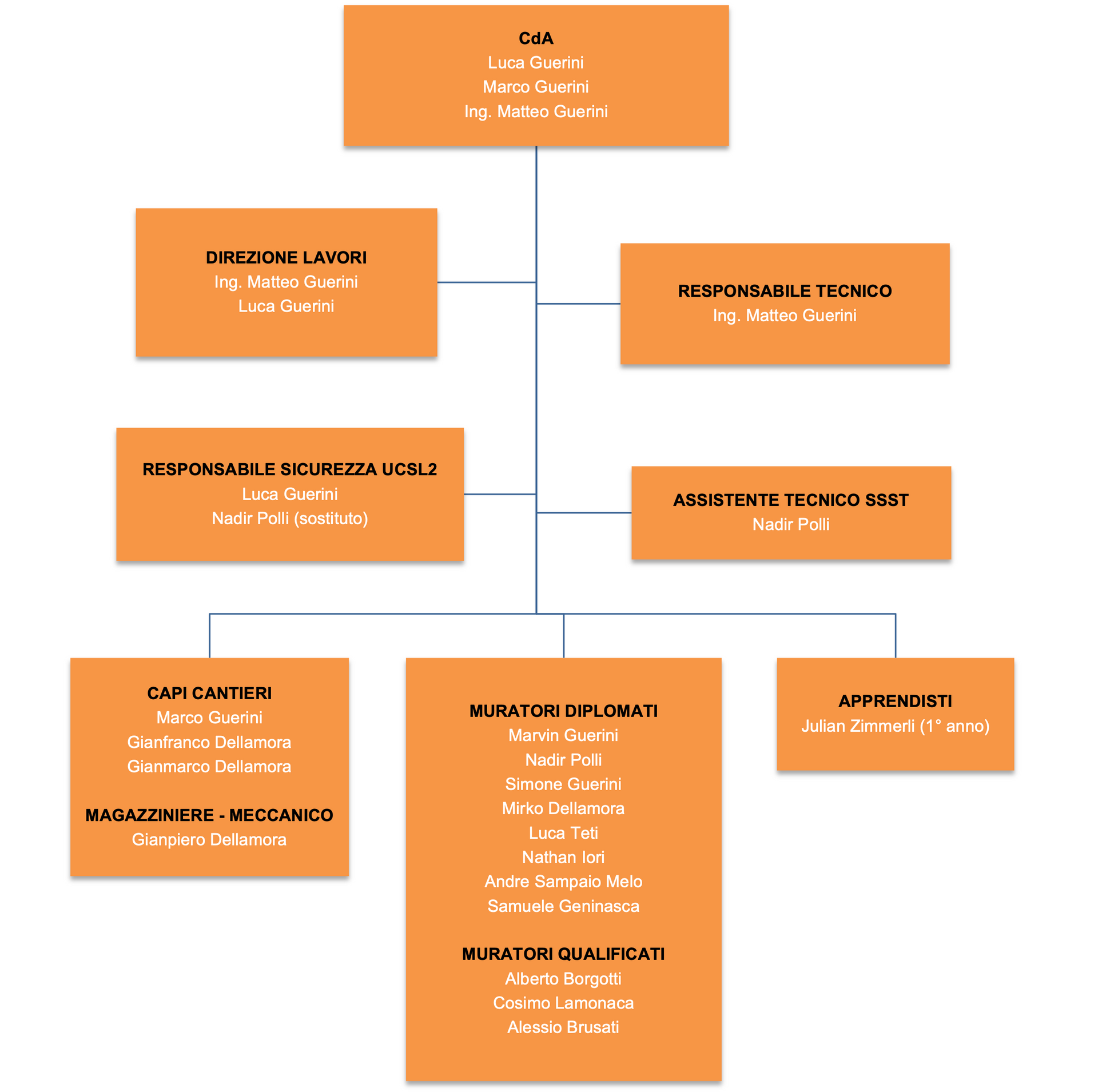 La direzione, gestione e amministrazione viene gestita dall'Ingegnere Civile Matteo Guerini, sotto l'attenta sorveglianza dei direttori e proprietari Luca e Marco Guerini e con il supporto dell'Assistente Tecnico Nadir Polli.